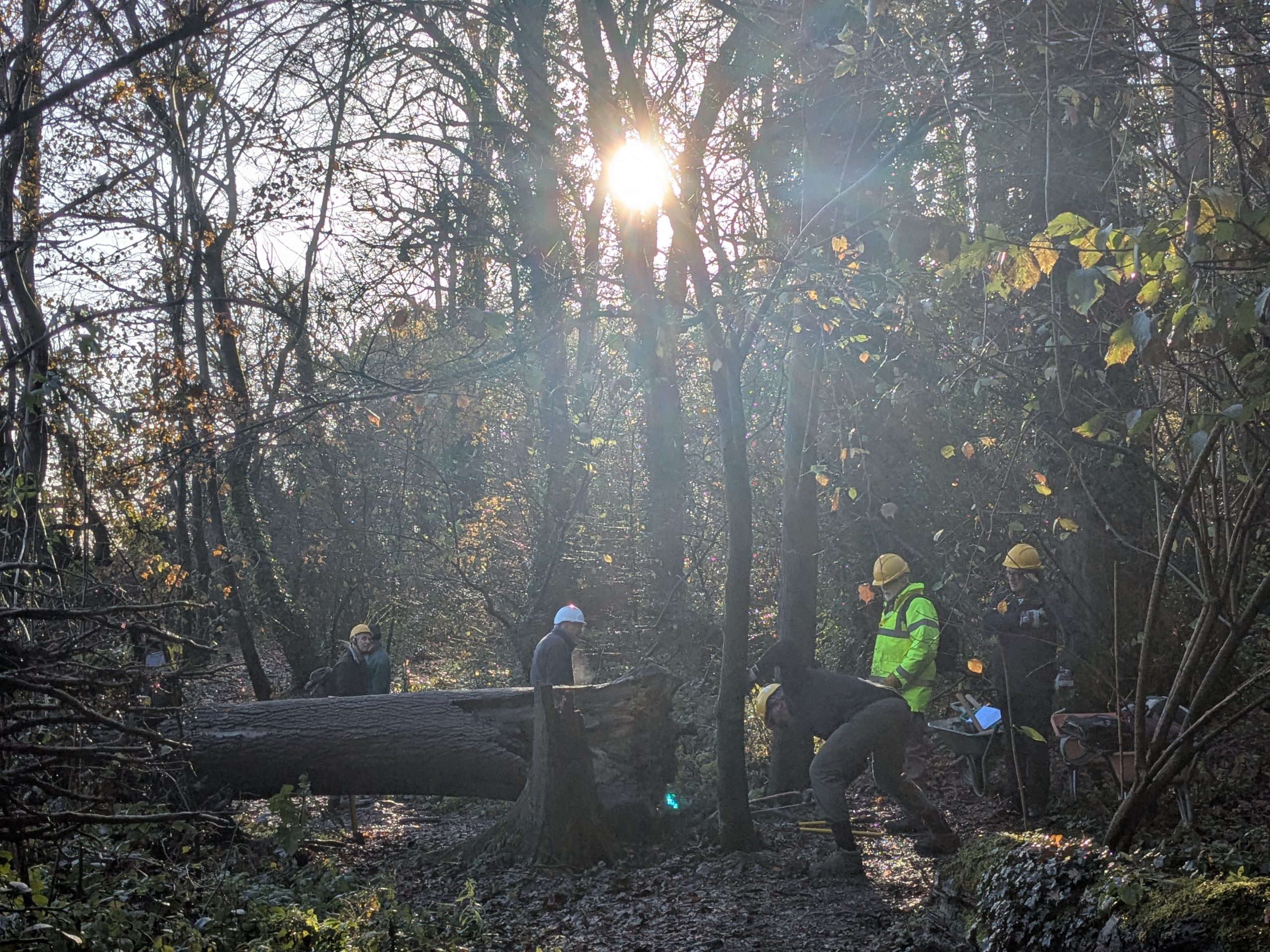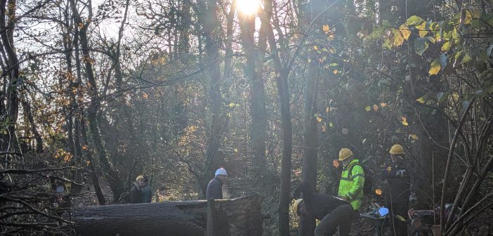 10 super volunteers were undaunted by the somewhat muddy conditions today. The weather was kind, allowing comfortable working sheltered from the westerly. The main task was coppicing more trees near the eastern path and extending/improving the path edging in the north-east. Some decent lengths of edging were obtained and fixed into position with stakes. Additional tasks included clearing bramble from the approach to one of our nest boxes (thanks to Will, with a modicum of help from his mum), uprooting a few invasive Sycamore saplings using our tree popper, removal of a few ancient nest boxes that were past their sell-by date and not worth repairing, and clearing mud from the start of the path up from Peveril Drive to allow easier passage of wheelbarrows. There was a noisy Great Spotted Woodpecker overhead at the end, but I doubt it was bothered by our removal of a few small trees. A big thank you to all who helped.