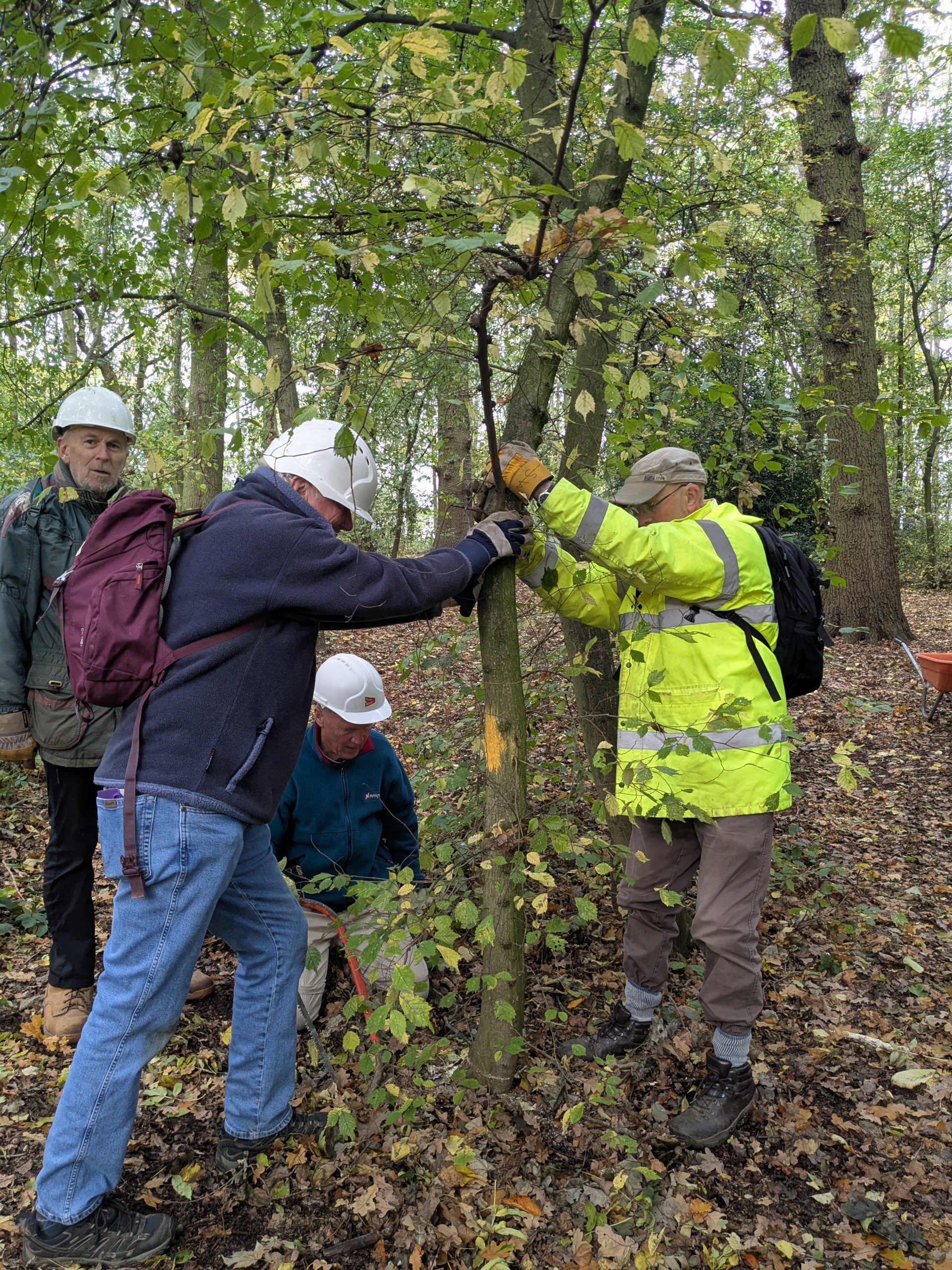 A fabulous crew of 11 accomplished today’s work in splendid fashion, finishing slightly early. We continued coppicing in the northern part of the wood, and used the material harvested to repair path edging along the northern path. Also a few volunteers tackled some Sycamore saplings with our tree popper. Thanks to all.