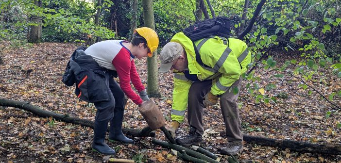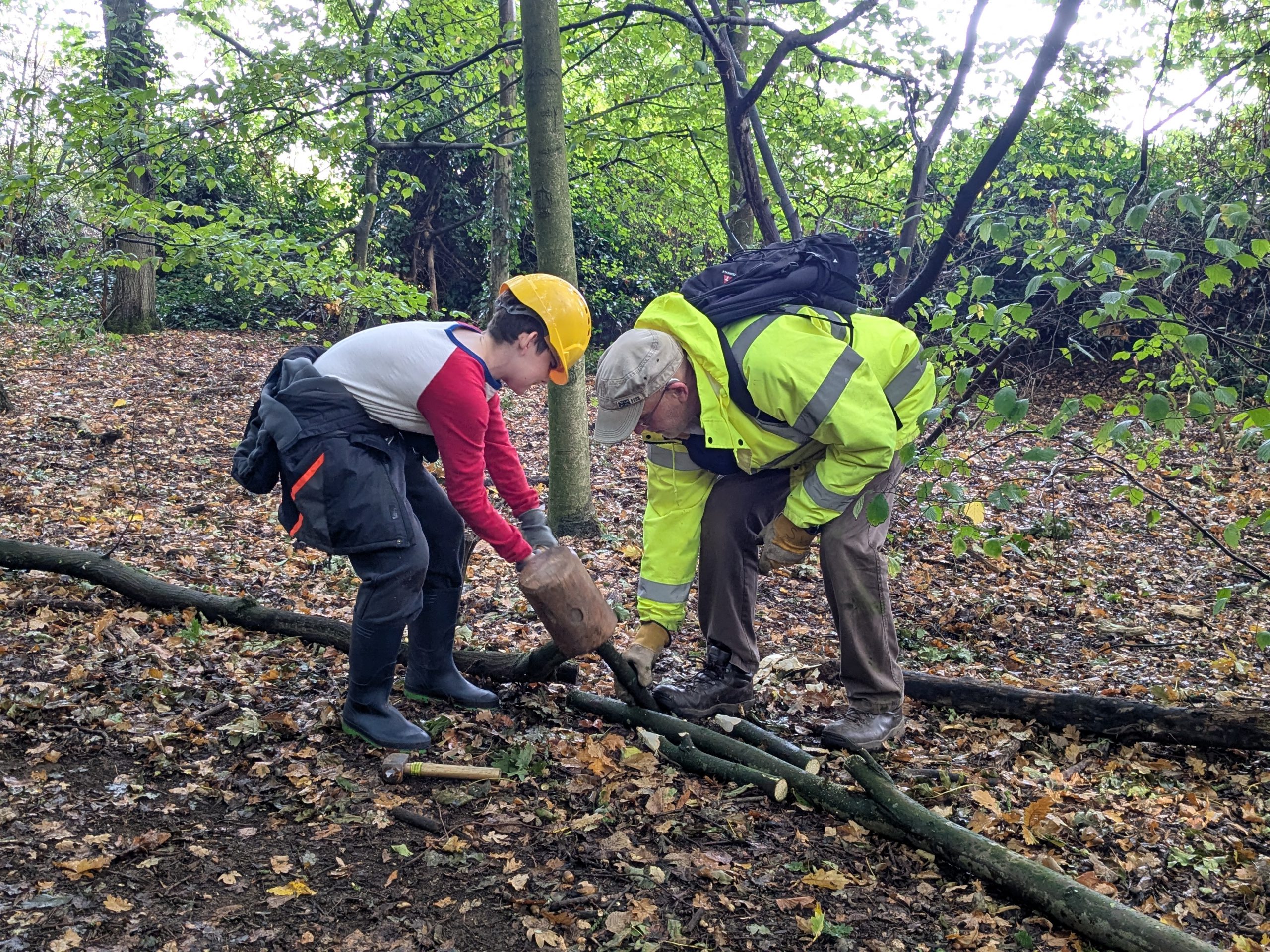 Today’s work party, in lovely weather, attracted 9 volunteers, including newcomers Alice and Duke of Edinburgh candidate Will. This was the first work party since the end of bird nesting, so we were able to get started on the autumn/winter jobs. Today we coppiced a few Wych Elms near the north-east corner and used the timber to replace or re-stake rotten path edging in that area. Bill, with help from Andrew and Julian, failed in an attempt to erect the Green Flag on a tree, as it was not possible to put it high enough. Bill also failed to cut the fallen Ash branch from the path on the SE corner, which will need further work. During the drinks break Julian pointed out some Hornets flying around some trees in the area. Several people had to leave early, so we packed up shortly after noon having accomplished a reasonable amount. Thanks to all.